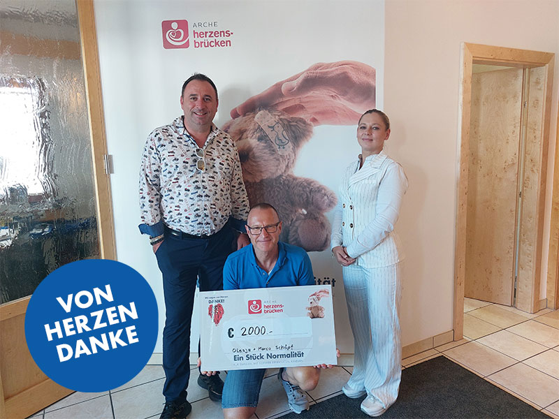 Mit einer Spende von 2.000 Euro unterstützen Olesja und Marco Schöpf Arche Herzensbrücken und unsere Arbeit mit schwer erkrankten Kindern und tragen dazu bei, dass wir unsere Vision weiter verwirklichen können.