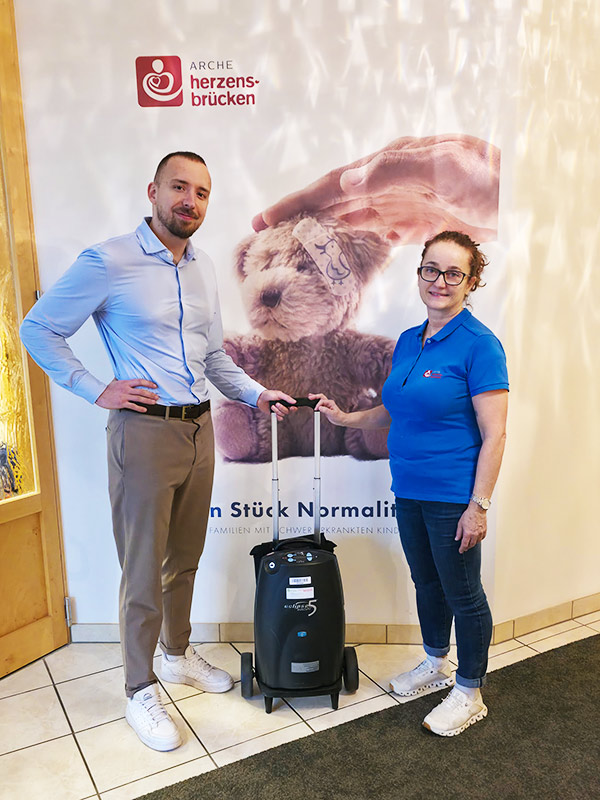 Dominik reagierte schnell und mit großer Selbstverständlichkeit. Innerhalb kürzester Zeit wurde ein mobiler Sauerstoffkonzentrator (Eclipse) bereitgestellt – damit das kleine Mädchen mit ihrer Familie sicher nach Hause reisen konnte. Besonders entscheidend dabei war die kontinuierliche Sauerstoffabgabe. Das Gerät kann sicher über den 12-Volt-Anschluss im Auto betrieben werden. Zusätzlich besteht die Möglichkeit, Sauerstoff direkt in die vorhandene Beatmungsmaschine einzuspeisen – ein weiterer wichtiger Sicherheitsaspekt.